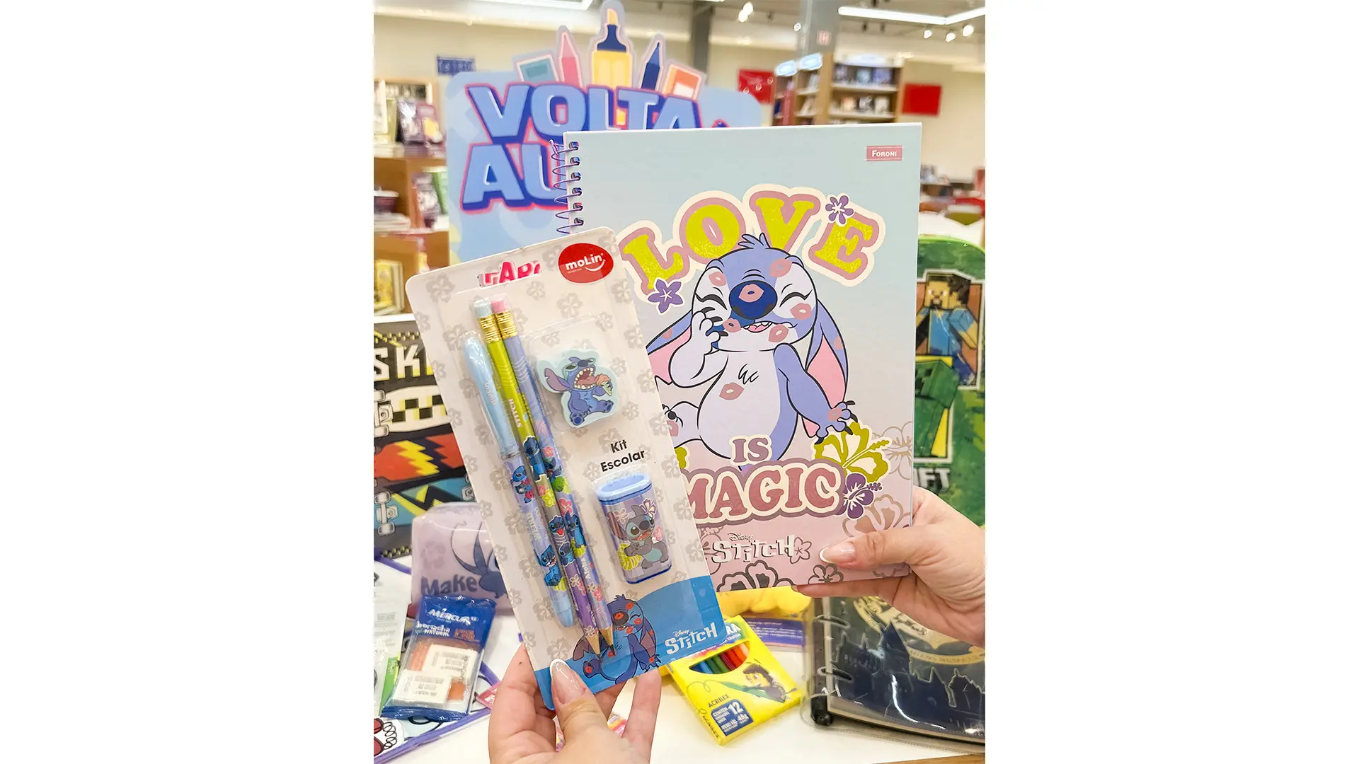 Para quem ama Stitch, vai poder fazer a festa com itens com: Kit Escolar Stitch Molin (contendo uma 1 caneta esferográfica azul, 2 lápis pretos HB, 1 borracha e 1 apontador com depósito, por R$ 35,90), Estojo PVC Stitch DAC (de R$ 76,20 por R$ 69,00), Caderno de Anotações com pasta zíper Zona Criativa (de R$ 199,00 por R$ 159.00), Caderno universitário 1x1 80 folhas Foroni (de R$ 65,20 por R$ 49,90), e muito mais!