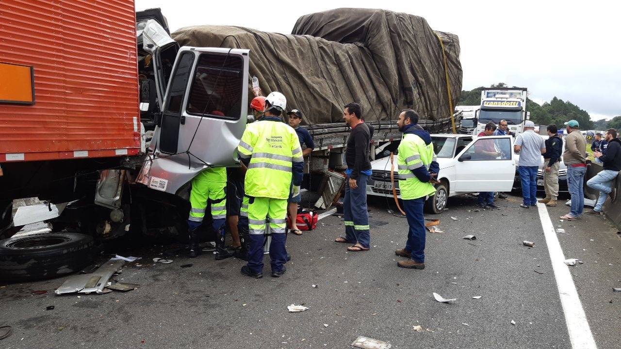 Pouco tempo depois, também no sentido Curitiba da rodovia, outro engavetamento complicou o trânsito. Três caminhões e dois carros bateram. Um dos caminhoneiros acabou se ferindo gravemente e foi encaminhado em estado grave ao Hospital Angelina Caron, em Campina Grande do Sul, na Região Metropolitana de Curitiba.
