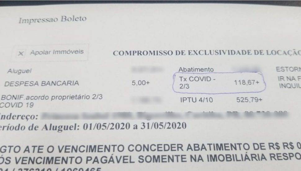 O empresário se surpreendeu ao notar no boleto de pagamento do aluguel do imóvel comercial uma taxa diferente do habitual em julho. Identificado como “taxa adm covid”, o valor passou a aparecer no boleto do aluguel desde abril e o empresário já havia pago por dois meses a taxa sem perceber.