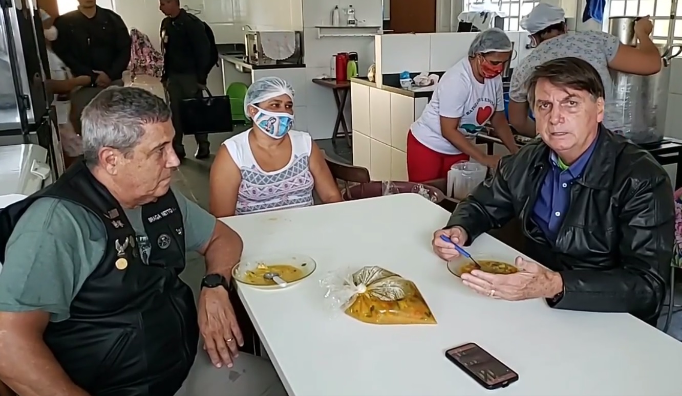 O presidente Jair Bolsonaro fez uma transmissão nas redes sociais neste sábado (3) ao lado do ministro da Defesa, Walter Braga Netto, em que aparece tomando sopa na região administrativa de Itapoã, no Distrito Federal, a 15 km de Brasília.