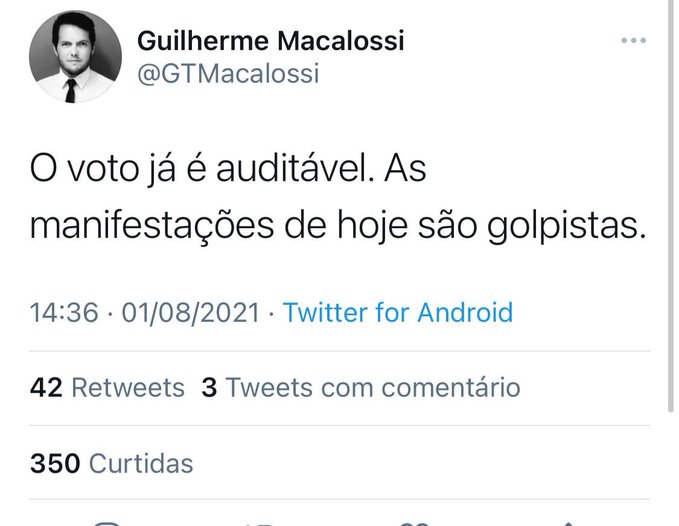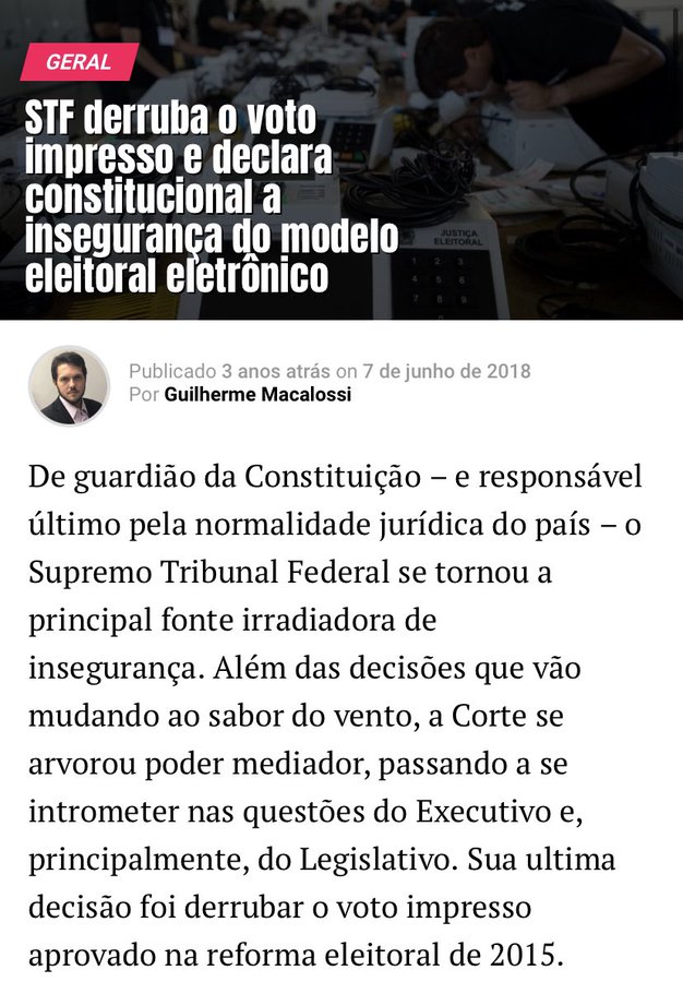 O mais bizarro é que quem faz isso hoje, ainda ontem defendia a mesma pauta! Ou seja, essa guinada abrupta no discurso gera ainda mais desconfiança, e com razão. Quem mudou tanto em tão pouco tempo e por qual razão? Vejam o caso do jornalista da rádio Band, Guilherme Macalossi, por exemplo. Ele chamou de golpista a manifestação pacífica e democrática que pedia voto auditável, mas ele mesmo acusava o STF de gerar insegurança por se recusar a adotar o voto auditável há apenas três anos!
