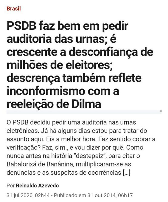 Fosse um caso isolado de alguém insignificante, era melhor ignorar. Mas tem método! E Macalossi teve com quem aprender. Reinaldo Azevedo, seu ídolo, sempre demonstrou inclinação tucana, mas hoje não esconde que "lulou" de vez. Ele também queria mudanças nas urnas, como todo o PSDB, que tentou fazer auditoria nas eleições de 2014 e descobriu ser uma missão impossível: