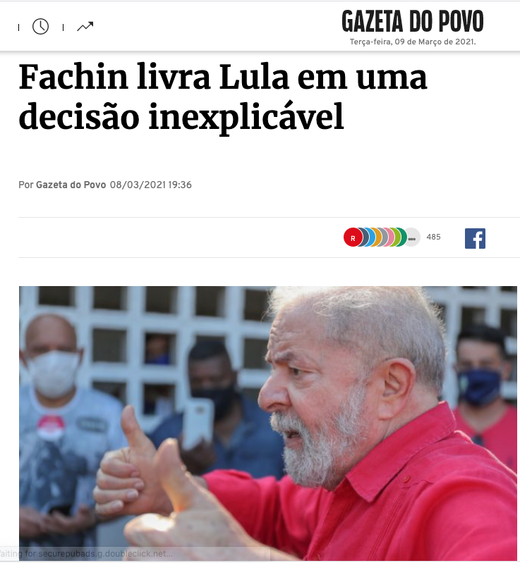 É um espanto! O Estadão bate todo dia em Bolsonaro, compara o presidente ao que há de pior, tenta responsabiliza-lo por cada óbito na pandemia, "passa pano" para o STF, e agora consegue culpar Bolsonaro pelo risco Lula, no dia seguinte à decisão de Fachin. Que diferença para a análise da Gazeta do Povo, um jornal sério:
