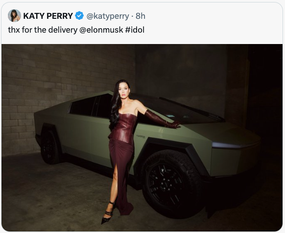 Katy Perry aderiu ao conluio das milícias digitais da extrema direita global. Sim! A cantora pop. Como fui capaz de descobrir isso? Vi uma postagem da celebridade com um carro da Tesla – aquele que parece um tanque de guerra – agradecendo a ninguém menos do que Elon Musk pela entrega, a quem depois chamou de "ídolo".