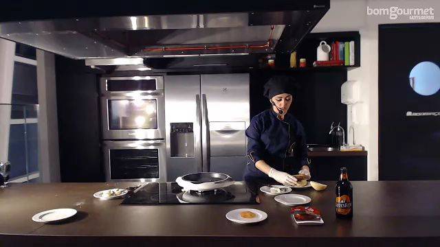 A Chef Jéssica Muzeka, que comanda a cozinha do Muzik Hamburgueria, ensinou no Estúdio Bom Gourmet Pátio Batel o preparo de um hambúrguer de linguiça Blumenau servido com queijo cheddar, alface e tomate no pão crocante.