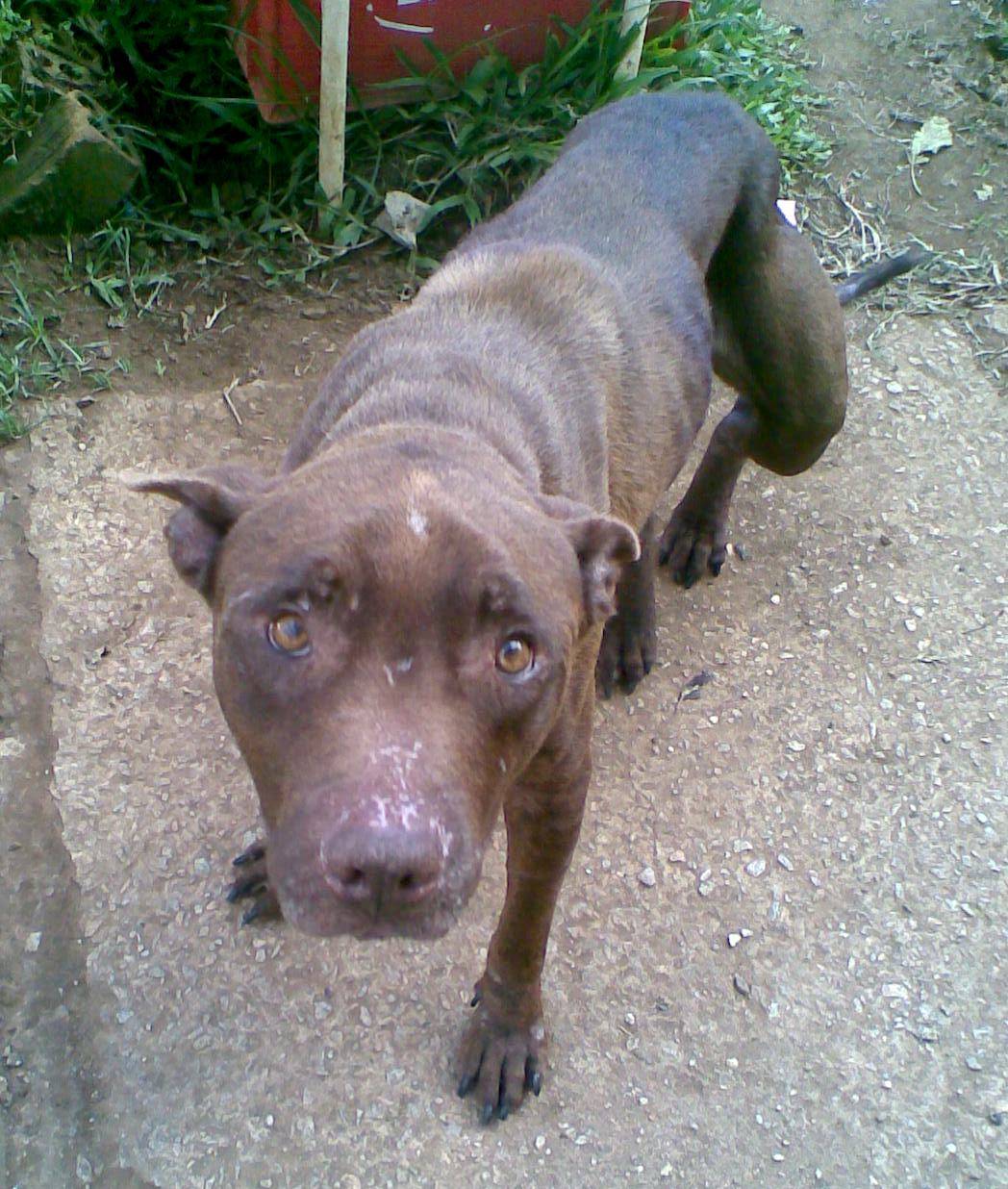 Este da foto ao lado é o Chocolate, um pitbull supercarinhoso que foi encontrado desnutrido e com alergias espalhadas pelo corpo. Ele tem já é adulto, tem cerca de 24 kg e – como o próprio nome sugere – tem pelagem na cor chocolate. Agora, as feridas estão melhorando e ele será castrado e vacinado em breve.