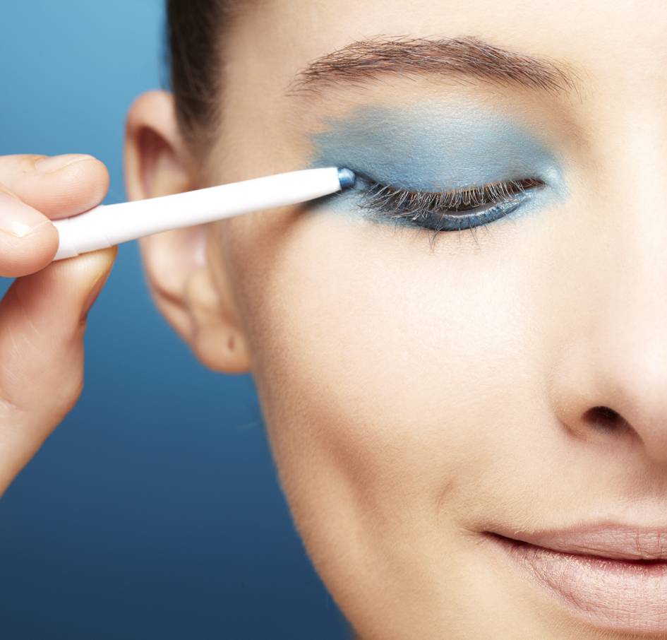 Passo 2: Nos olhos, antes da sombra, aplique um lápis azul em todo contorno e cubra toda pálpebra móvel. Complete com sombra azul e em seguida escolha uma sombra azul em pó e use sobre todo o lápis.