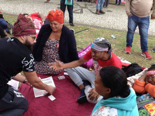 O pessoal por enquanto quer é saber de uma conversa e de um descanso. A viagem foi longa e muitos dormiram em barracas. Ainda vão enfrentar a volta. Numa roda, o pessoal do movimento negro de São Paulo joga baralho, turbantes coloridos na cabeça. As cores, aliás, são o que mais chama a atenção na praça. Não é só o vermelho do partido.