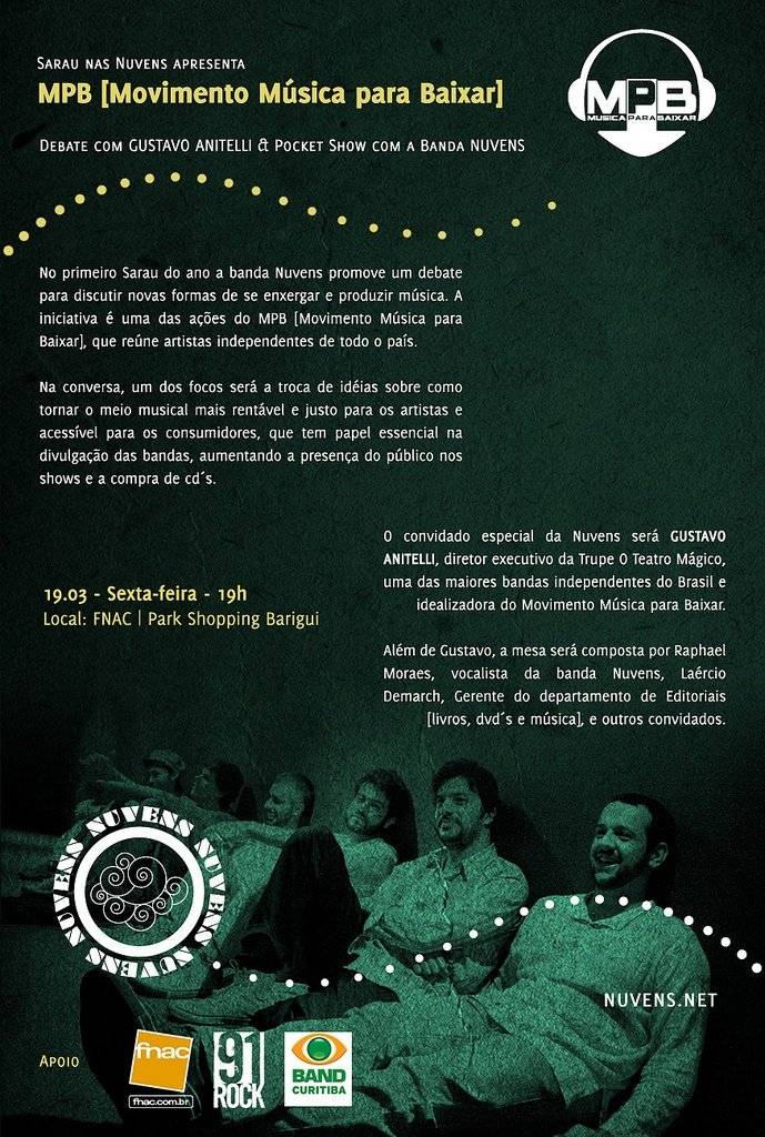 A banda Nuvens recomeçou o agito dos saraus que deu uma força para a cena artística curitibana no ano passado. Primeiro sarau é o que segue abaixo: