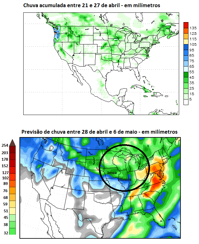Na última semana, as plantadeiras tiveram dificuldade para entrar em campo por conta do excesso de umidade e das baixas temperaturas registradas no Meio-Oeste norte-americano, principal região produtoras de grãos dos Estados Unidos.