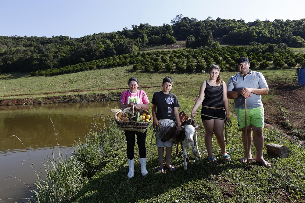 A família de Juceli, 33 anos, Eduarda, 13, Alex, 11 e Evandro Carlos Costela, 37, sabe fazer quase tudo. Criação de suínos, gado de corte, gado de leite e peixes se encaixa na produção de grãos e frutas. Foto: Jonathan Campos/Gazeta do Povo (Foto: )