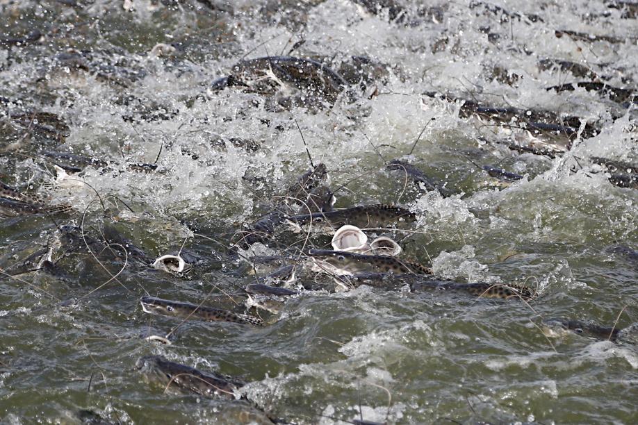 Com um trator, a ração é jogada sobre a água, fazendo com que poucos segundos os peixes se aglomerem na superfície. Em seis meses de trabalho, chega-se a peixes de 1,5 a 2 quilos, peso ideal para abate e processamento.