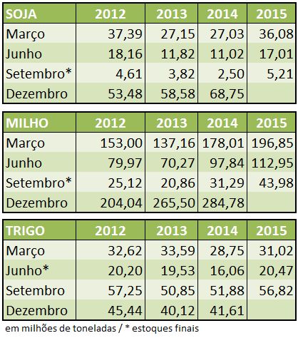No caso do milho, o número apresentado pelo USDA representa uma redução de 1 milhão de toneladas ante o volume projetado pelo órgão no último relatório de oferta e demanda, divulgado no início do mês. Apesar disso, são as maiores reservas em nove anos. A soja, que no início do mês tinha estoques projetados pelo USDA em 6,53 milhões de toneladas acabou fechando a safra 2014/15 com reservas ainda menores, mas, ainda assim, o maior volume dos últimos quatro anos.