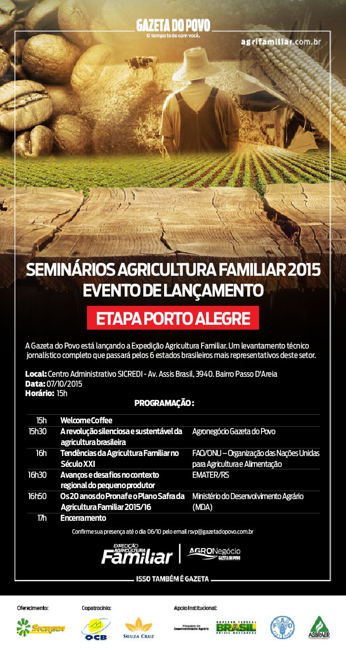 No dia 7 de outubro, uma segunda equipe realiza o lançamento oficial do projeto, com o seminário “Tendências da Agricultura Familiar no século XXI”, em Porto Alegre, no Centro Administrativo do Sicredi, a partir das 15 horas.