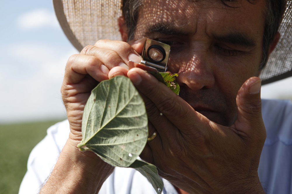 De olho na lavoura: na mesma região técnicos monitoram a existência de possíveis focos da ferrugem asiática nas lavouras de soja. (Foto: )
