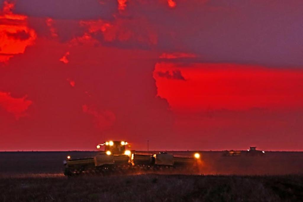 Final de tarde em Chapadão do Sul gera um céu avermelhado para emoldurar as plantadeiras na lavoura. (Foto: Albari Rosa/Gazeta do Povo)