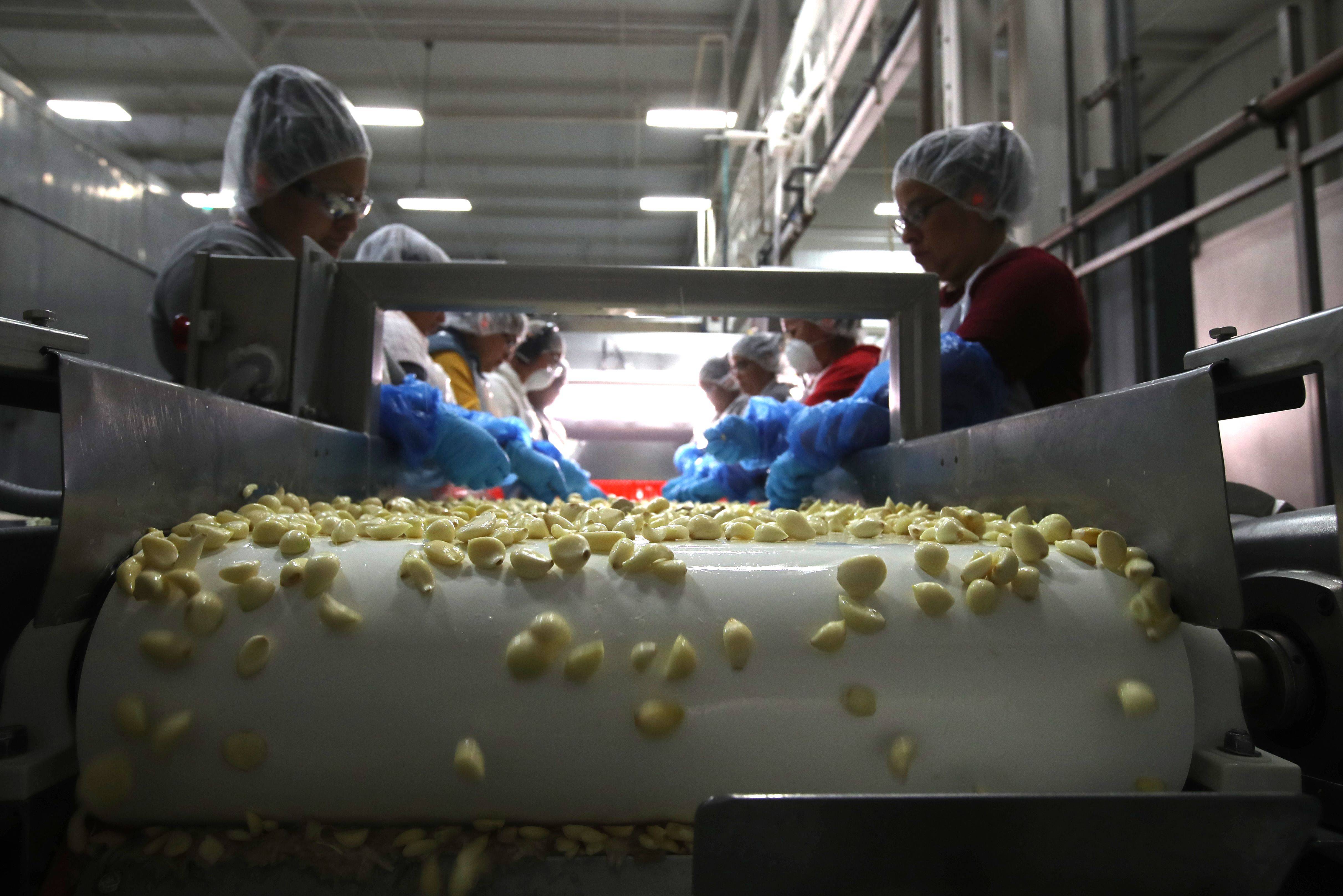 Na foto acima, feita nesta semana (26/06), trabalhadores separam dentes de alho em linha de produção da marca Christopher Ranch em Gilroy, na Califórnia.