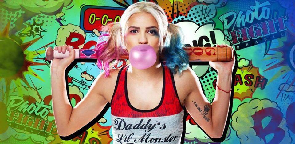Cabelo colorido, maquiagem e roupas chamativas, além do taco de beisebol usado por Harley Quinn no filme ‘Esquadrão Suicida’, agora fazem parte do ritual da atleta antes das lutas. Com um traje impossível de não chamar a atenção, ela se garante também na hora da porrada.