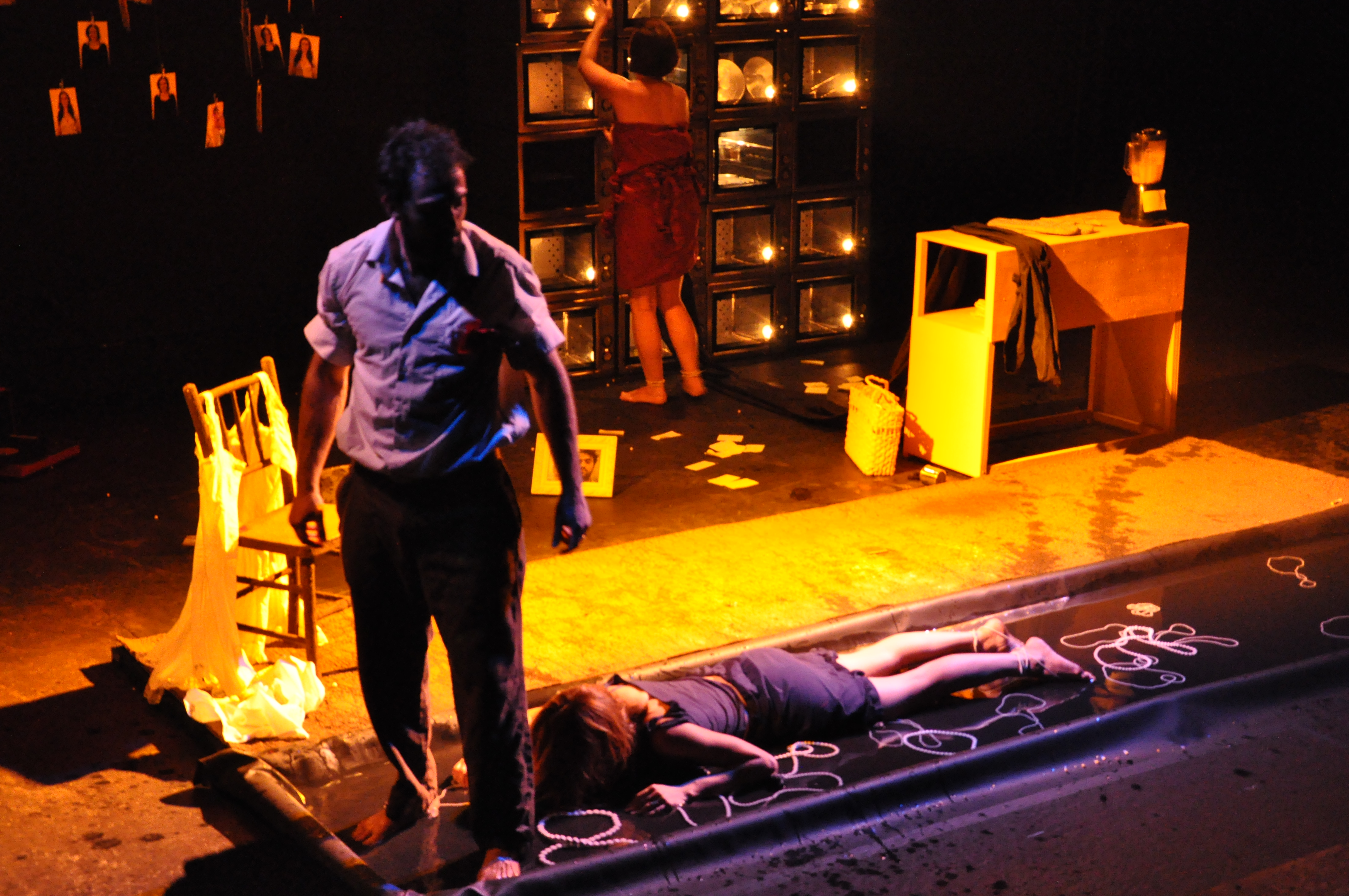 As atrizes Anna Zêpa e Tânia Reis constroem em cena cada uma das quatro mulheres que compõem os contos. Kuarahy Fellipe interpreta a figura masculina, que está presente em todos os contos (ainda que em alguns momentos se apresente na ausência).