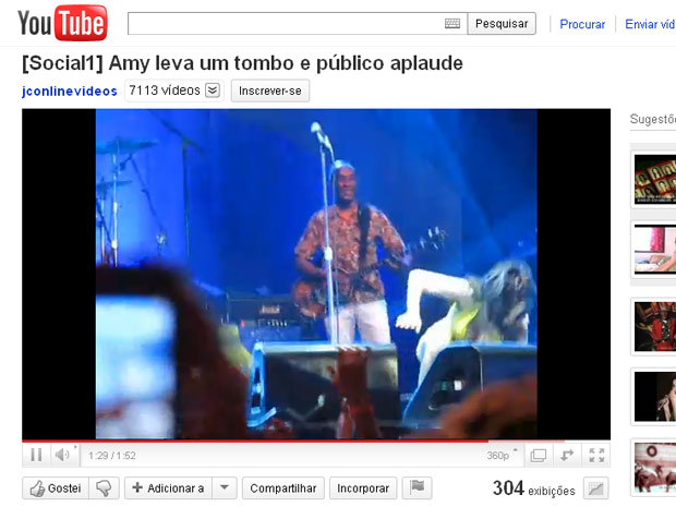 A cantora Amy Winehouse escorregou e caiu durante sua apresentação no Recife nesta quinta-feira (13). Ao final de uma das músicas, Amy ensaiou um rodopio, mas perdeu o equilíbrio e levou um pequeno tombo sobre o palco.