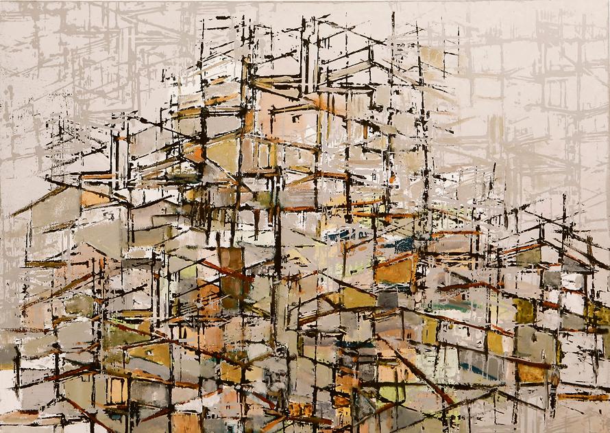 O que vemos na sequência da exposição são as pinturas das construções, mais evidentes a partir do final da década de 1960. E com infinitas possibilidades de tratamento: há quadros com linhas mais soltas, outros, como Paisagem Urbana (1994), trazem traços pretos pronunciados, que marcam bem as formas.