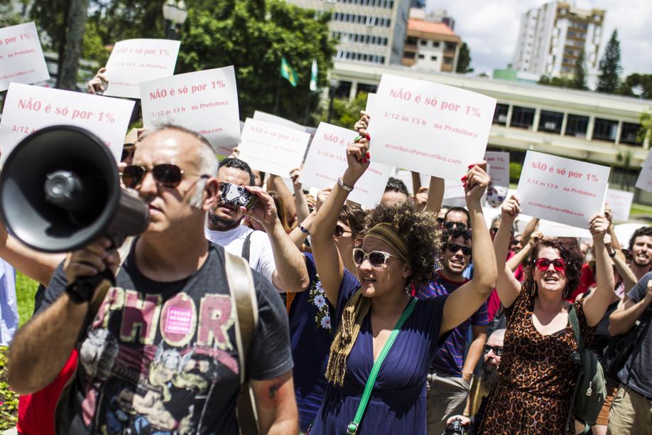 Cerca de 50 artistas se reuniram na tarde desta quarta-feira (3), por volta das 13 horas, em frente à Prefeitura Municipal de Curitiba para protestar contra a atual gestão da Fundação Cultural de Curitiba (FCC) e pedir mudanças para a classe. Eles fazem parte do grupo "Frente Acorda Cultura Curitiba", que lançou, no dia 13 de novembro, o manifesto "Não é só por 1%".