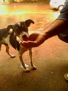 Ninguém sabe de onde surgiu. Adotou o bar, e foi adotado pelos fregueses. Dão-lhe pedaços de salgados, que ele come de preferência na mão, pois, se o pitéu for jogado no chão, ele cheira antes, olha a pessoa reprovadamente, aí come devagar. Na mão da gente, no entanto, come sem vacilar e depressa, depois senta nas patas traseiras e fica encarando, esperando mais. Ninguém deixa de lhe dar ao menos mais um pedaço, aí ele volta a deitar, parecendo cochilar, mas sempre atento. E é naturista, não come salgadinhos.