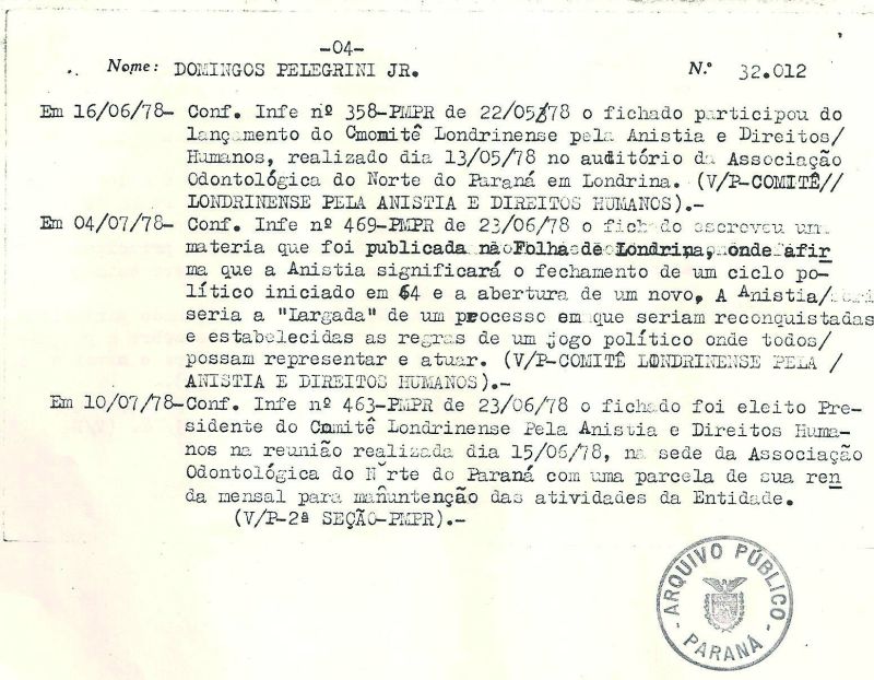 Na ficha consta que presidi o lançamento do Comitê Londrinense pela Anistia. Não consta que policiais rondaram o prédio, lançando boato de bomba. Pedimos varredura à PF, riram. Então o jornalista Joel dos Santos Guimarães vasculhou até as privadas, rastejou pelas entranhas do prédio, e só depois que, com os cabelos cheios de teias de aranha, ele falou "Tudo limpo", autorizamos a entrada do público. Na ficha devia constar que aquela noite teve um herói chamado Joel.