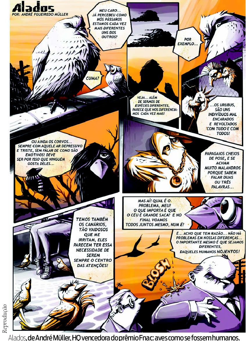A história em quadrinhos vencedora do prêmio Fnac, Alados, é uma crítica social. Os personagens são aves, e cada uma representa uma tribo urbana: urubus são os punks, os "emos" são os corvos e o pessoal do hip-hop, os papagaios. "Tem a ver com uma espécie de revolução dos bichos", define Müller.