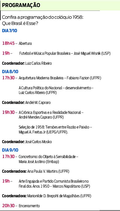 Debates sobre o período que sepultou a rodrigueana "síndrome do vira-lata" e fez com que brasileiros tivessem orgulho de seu país e de sua cultura acontecem de hoje a quinta-feira no colóquio 1958: Que Brasil É Esse?, realizado pelo Núcleo de Estudos Futebol e Sociedade da Universidade Federal do Paraná (UFPR).