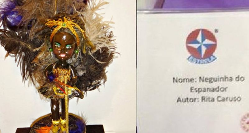 A boneca que gerou polêmica foi pintada de preto. Ela retrata uma mulher em trajes de carnaval e traz adereços feitos com penas, o que lembra espanador.