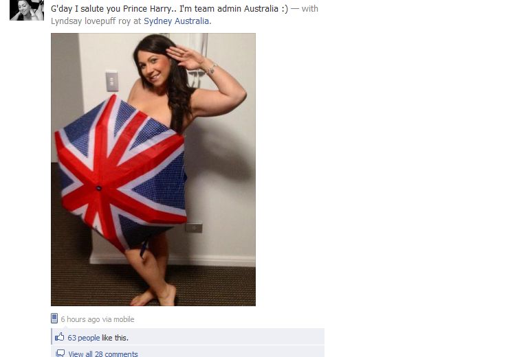 Mais de 14 mil pessoas se uniram no fim de semana a uma página do Facebook chamada "Apoie o príncipe Harry com uma saudação nua" e dezenas delas tiraram as roupas como demonstração de simpatia ao príncipe, fotografado nu há 10 dias nu Las Vegas.