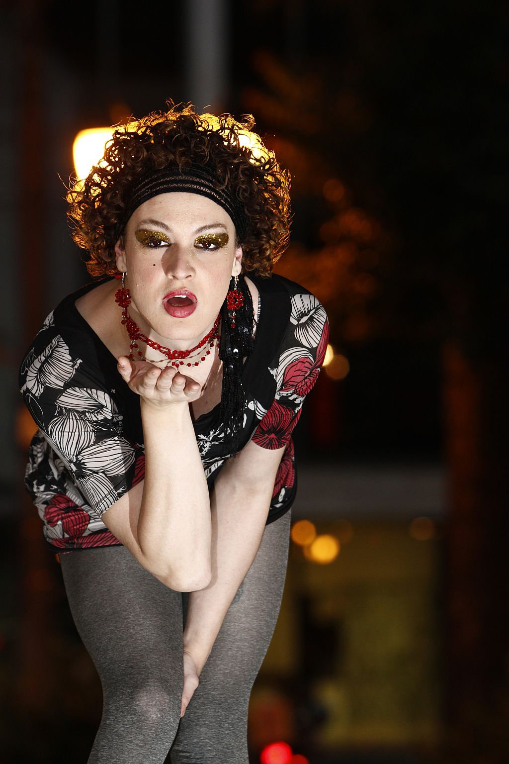 Léo Glück desce do táxi escondendo o vestido colorido sob um casaco preto, mas o dourado da sombra e de alguns cílios postiços ofusca imediatamente quem a vê. Olha as redondezas da Praça Santos Andrade, rejeita um canteiro de flores vermelhas mirradas ("decadente") e escolhe se deitar na grama para ser fotografada. "Viu o que é a performance?", pergunta à repórter que ficou com a bolsa e o casaco da atriz entrevistada pendentes no braço, enquanto esperava a sessão de cliques acabar.