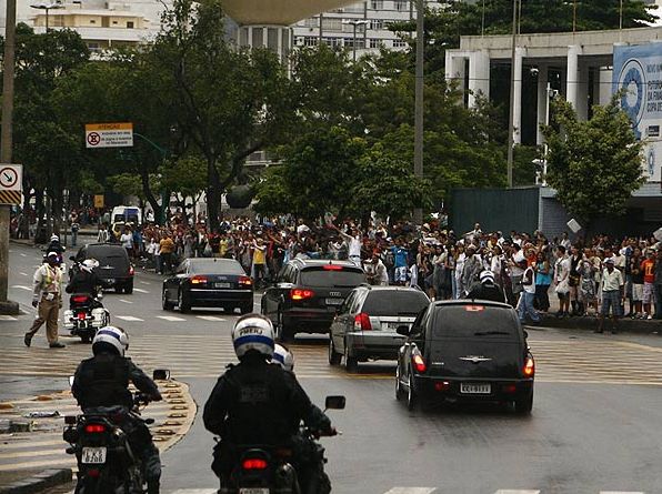 Para o percurso entre o hotel e o Maracanã, a loura seguiu em carro fechado e contou com escolta de seguranças particulares e batedores da Polícia Militar.