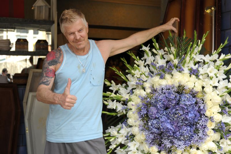 "Lembro muito da Ilha, quando eu brincava atrás do cemitério da Cacuia. Ia pegar fruta lá e diziam que vinha grudada com o morto. Pé na Cova é uma volta a esse subúrbio de forma mais apocalíptica. No seriado que a Globo estreia dia 24 de janeiro, Russo é o patriarca de uma família paupérrima com ares de Adams. Vive às turras com a ex-mulher alcoólatra Darlene, interpretada por Marília Pêra, é pai de Odete Roitman (Luma Costa) e "sogro" de Martnália, que namora sua filha.