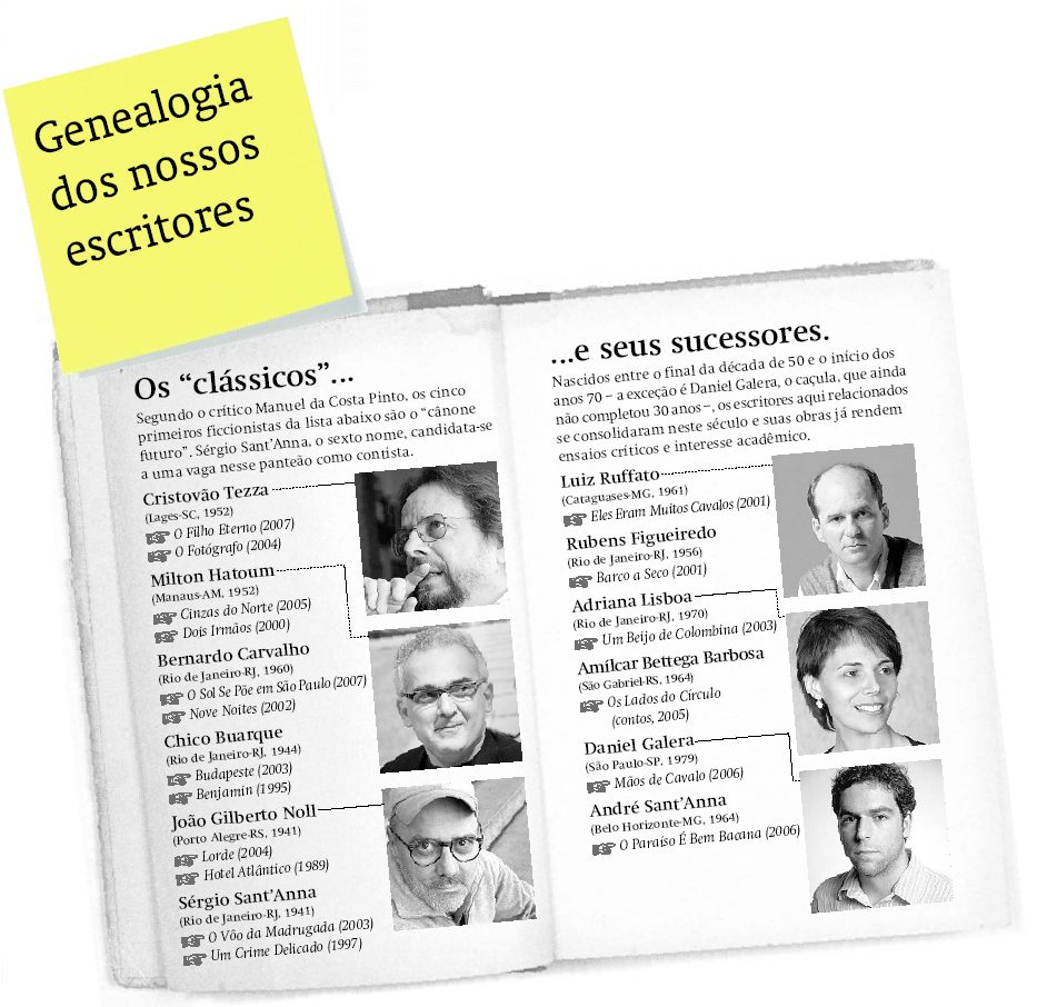 "Sérgio SantAnna é o escritor em atividade que mais admiro e mais me influencia. Da minha geração, posso dizer que tenho alguns amigos, como o Chico Mattoso, o Antonio Prata e o Joca Terron que, na verdade, é da Geração 90, mas senta à nossa mesa no bar para se sentir mais jovem. Falando sério: o Joca é um farol, uma referência, e tem uma verve de crítico que eu, por exemplo, não tenho. [Mas] somos uma geração sem manifesto, afinidade estética ou algum tipo de plano, como tinha o Modernismo. Mesmo assim, acho que é uma literatura que consegue dar conta do que é o Brasil neste início de século."