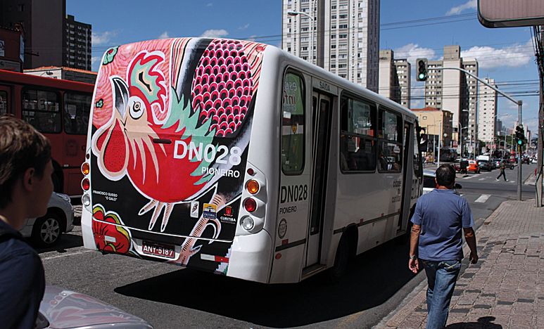 Os micro-ônibus brancos da linha que contorna a malha central de Curitiba estão circulando com novo visual na parte traseira, trazendo obras dos artistas visuais Francisco Gusso (na foto, sua pintura, intitulada "O Galo"), Bruno Stock, Thiago Syen, Fábio Follardor, Tié Passos e Juliana Burigo. As imagens, todas fixadas nos vidros por meio de plotagem, são fruto de um projeto vencedor do edital de Arte Urbana do Fundo Municipal da Cultura. Todos os temas procuram chamar atenção para os dilemas das grandes cidades e da sociedade atual.