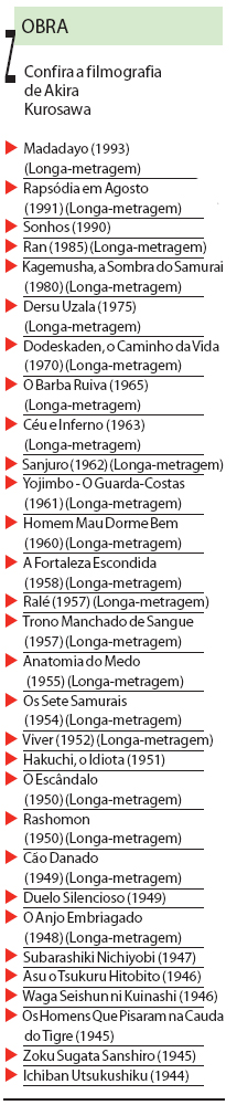 É difícil apontar um título que resuma a vasta filmografia de Kurosawa, o melhor filme de todos. Além dos já citados, há outras obras-primas, como Dersu Uzala, realizado numa coprodução com a União Soviética, e Os Sete Samurais, espetacular épico que eletriza e hipnotiza até hoje, dando um banho em grande parte do que se faz no gênero e influenciando. Em 1960, o longa teve um ótimo remake americano, o western Sete Homens e Um Destino, de John Sturges, mas também se veem ecos dos samurais de Kurosawa em Quentin Tarantino, um apaixonado pelo cinema japonês.