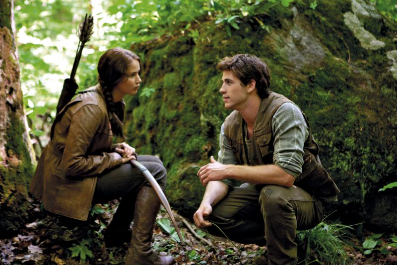 Katniss se oferece como tributo do Distrito 12 após sua irmã caçula, Prim (Willow Shields), ter sido sorteada. Ao seu lado, está Peeta (Josh Hutcherson), jovem que se revela apaixonado pela colega e rival, o que complica a vida não só do casal, mas de Seneca Crane (Wes Bentley), organizador do evento. Como em Crepúsculo, forma-se um triângulo, já que Katniss deixa para trás Gale (Liam Hemsworth) com quem vivia um romance.