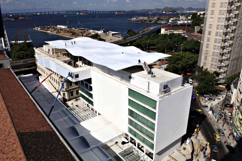 Sobre os dois prédios que formam o novo Museu de Arte do Rio (MAR), na Praça Mauá, uma gigantesca superfície ondulada e branca, feita com 800 toneladas de concreto, remete a um pedaço fluido do oceano. A cobertura de 1,7 mil m², sustentada por 37 pilares, é marca arquitetônica da instituição cultural carioca que será inaugurada amanhã com a presença da presidente Dilma Rousseff e autoridades; no sábado, para convidados; e na próxima terçafeira para o público. Foram cinco anos de trabalho, dois anos de obras e reformas, para estruturar o museu que coloca lado a lado a arte e a educação, como dizem seus organizadores. De um lado, o Palacete D. João VI, de 1916, é o complexo expositivo, com oito salões; do outro, um edifício da década de 1940 abriga a Escola do Olhar.