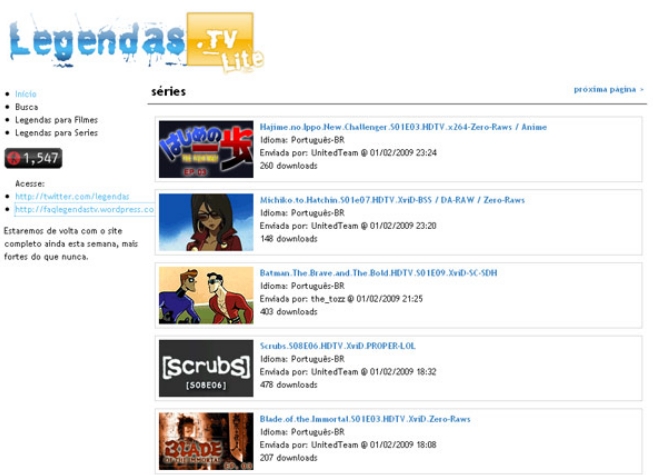O site brasileiro "Legendas.tv" voltou a publicar arquivos nesta quarta-feira (4), depois de ter seu conteúdo bloqueado devido a intervenções da Associação Anti-Pirataria Cinema e Música (APCM).