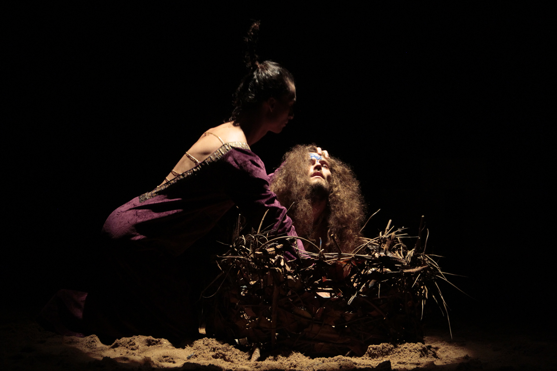 Fiorindo se permite apropriar do texto de maneira vertical, disposto a penetrar intersubjetividades, abrir fendas, plantar sementes. Não bastasse “decifrar” os códigos de Hermersdorff , o diretor elabora uma escrita de palco de vocabulário transgressor nas tentativas de instaurar silêncios, desprezar evangelhos, subverter tradições, rupturas, invocar energias. E nesse baião de dois (diretor e dramaturgo) que não vira triângulo, o público não se sente abraçado (para usar um gesto caro no desabafo de “A”: “Estamos todos presos do lado de fora de um abraço”).