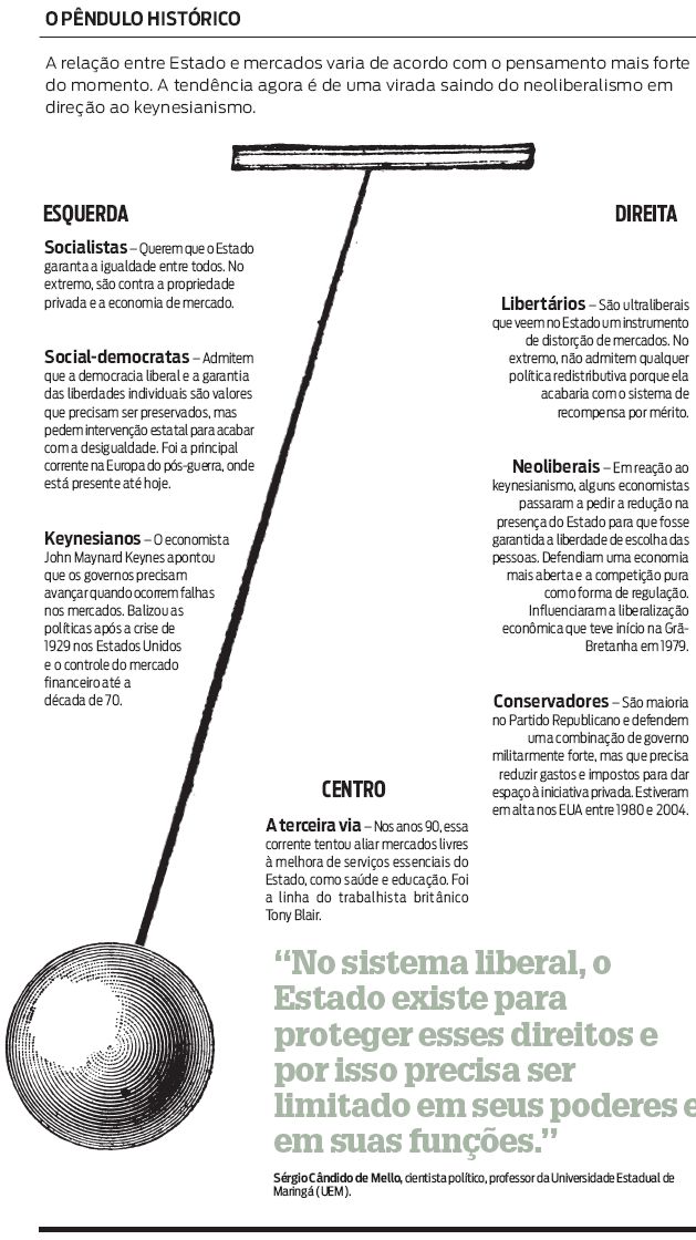O pêndulo do liberalismo estava na posição de intervenção estatal mínima entre meados do século 19, quando estava em alta o laissez-faire derivado de clássicos como Adam Smith, e o fim da Primeira Guerra. No período entre as guerras, a partir de 1930, o pêndulo caminhou em direção à intervenção maior do Estado. "O capitalismo enfrentava uma crise muito grave, em parte gerada pela falta de controle dos mercados. Foi nesse contexto que surgiu o keynesianismo", lembra Renato Colistete, professor de História Econômica da Faculdade de Economia e Administração da Universidade de São Paulo (FEA-USP).