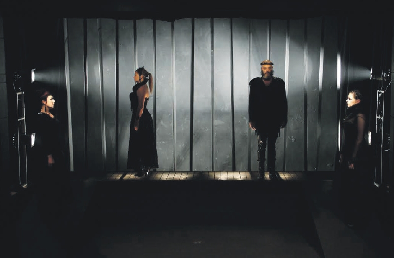 A ação, que no original é repleta de entradas e saídas, discussões, atos violentos e uma mitológica jornada em meio à tempestade, foi resumida a curtos movimentos pelo palco e diálogos. A conversa entre os personagens adquiriu tons de monólogo, quando os atores encaram a plateia, imóveis, sem interação entre si. Tudo em meio ao escuro, com o preto dominante.