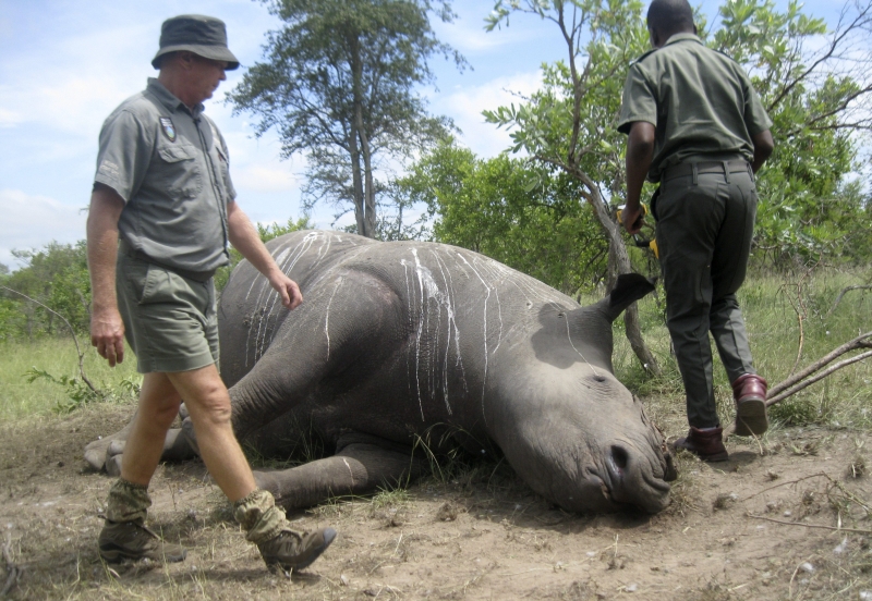 Imagem fornecida pelo Parque Nacional de Kruger, na África do Sul, com o investigador forense Frikkie Rossouw ao lado de um dos últimos rinocerontes mortos por caçadores, que estão em busca dos chifres desses animais. As autópsias dos rinocerontes mortos são fundamentais para que se consiga chegar até as pessoas que cometeram esse tipo de crime.
