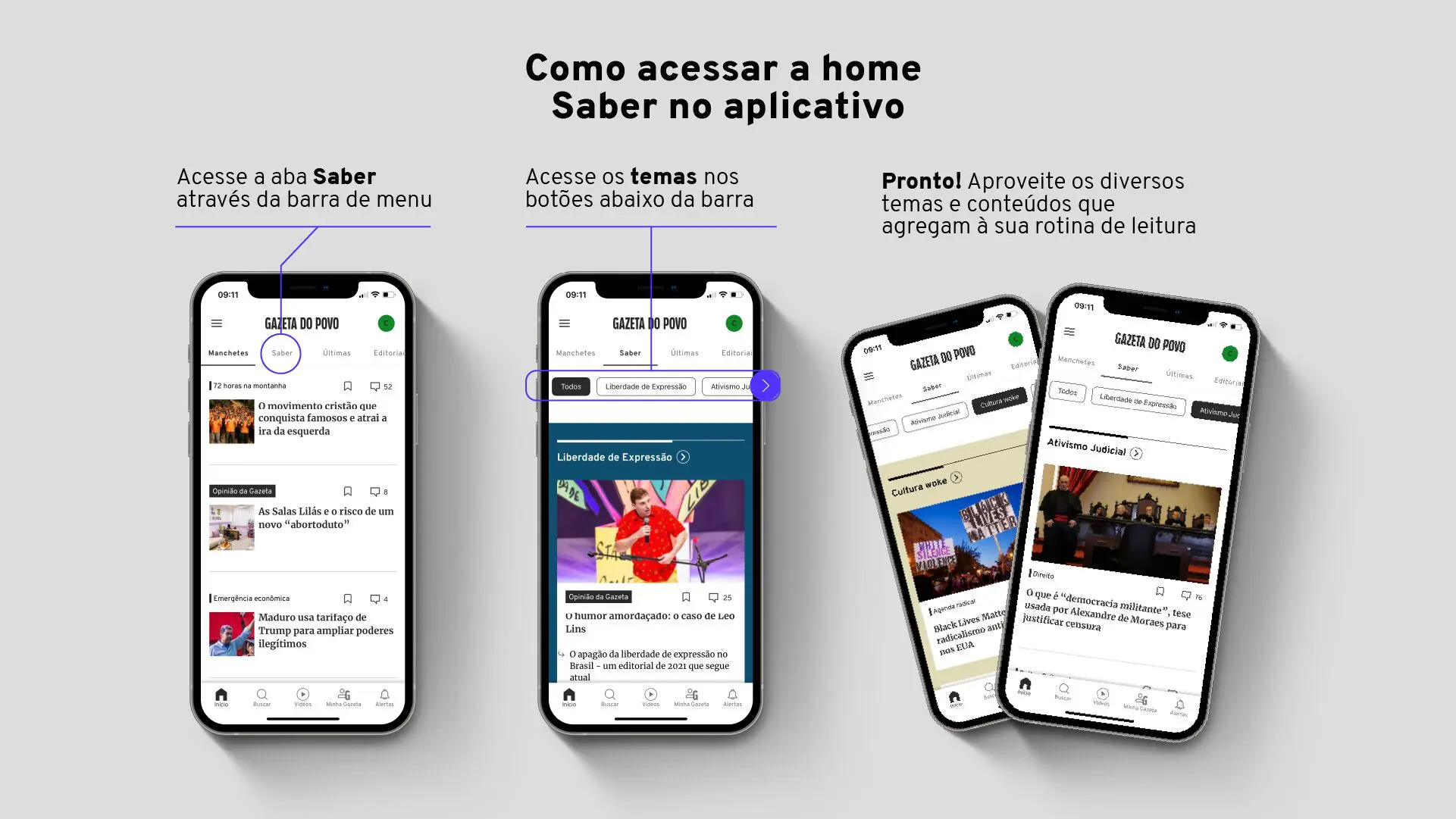 O 'Saber' fica na barra de menu da Gazeta do Povo, ao lado de Notícias. Para ver todos os temas disponíveis, basta rolar a página ou, no caso dos apps, selecionar os assuntos no topo da página.
