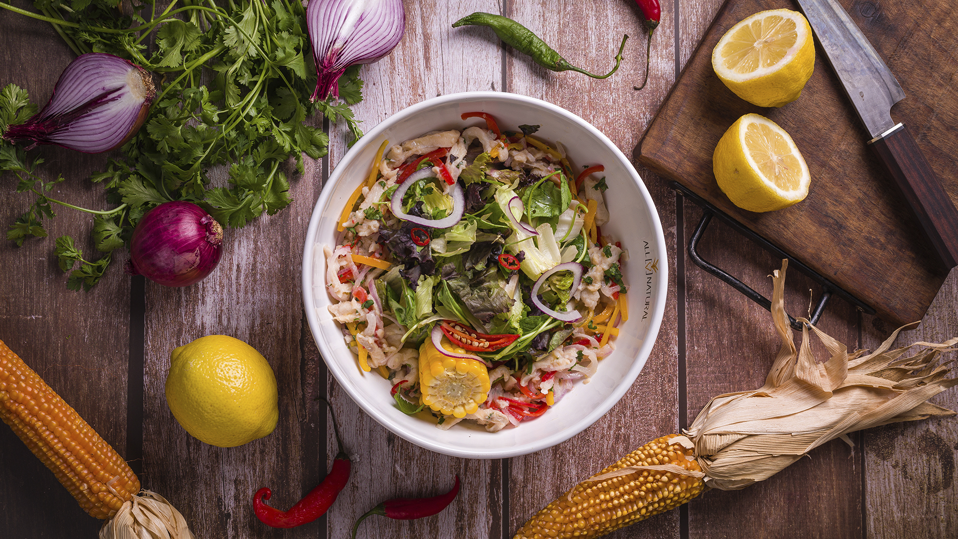 Um detalhe charmoso é que os nomes dos pratos também são especiais: todos foram pensados de forma a fazer ligação com o local de origem de cada um. Um bom exemplo é o Ceviche Punta Hermosa - prato original do Peru, ele ganhou uma releitura do All Natural e um nome que faz referência ao litoral do país.