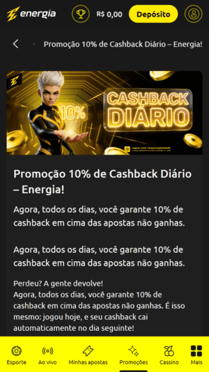 - Energiabet: Casa de apostas responsiva com 10% de cashback