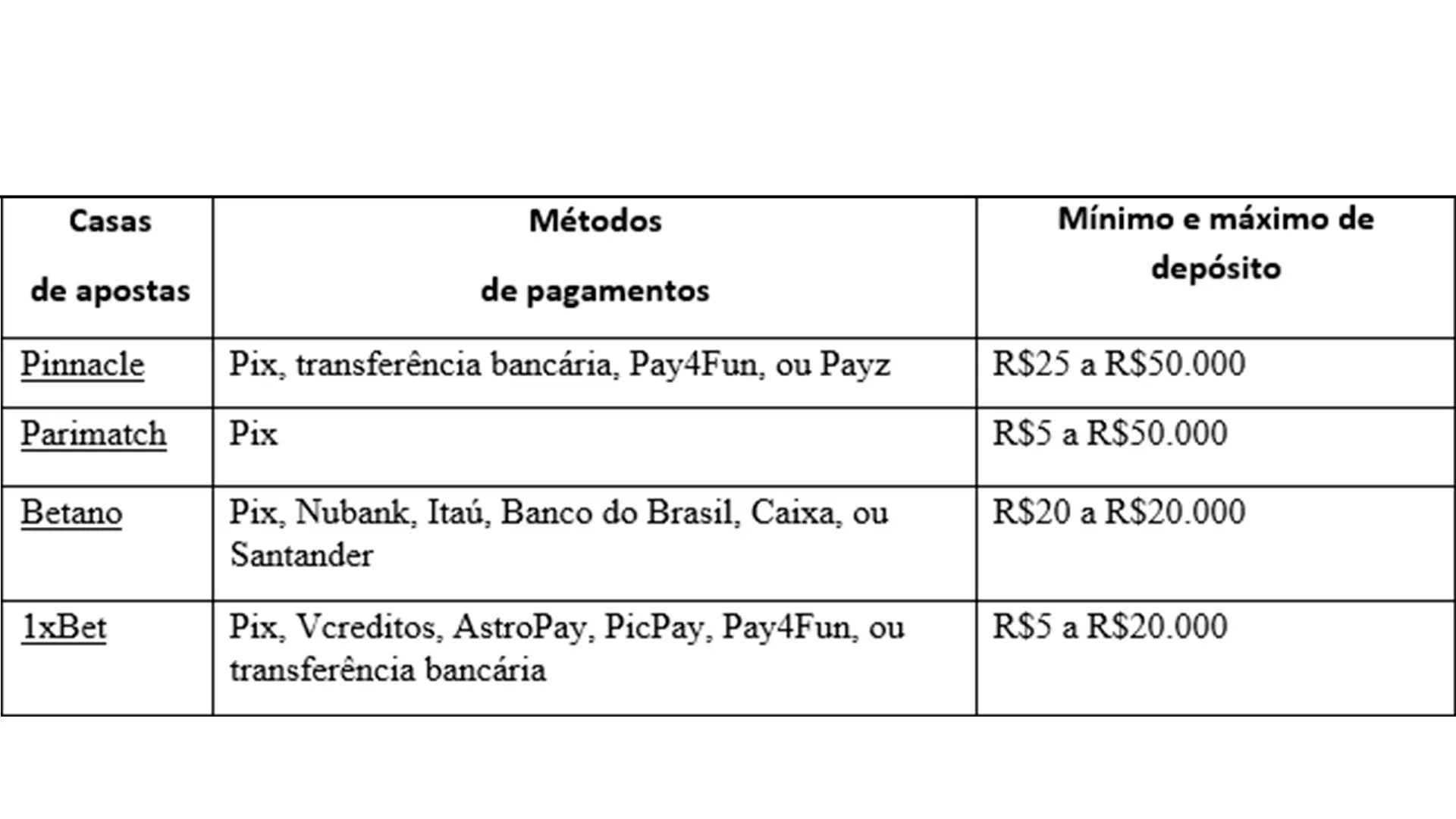 Tudo isso precisa estar claro em uma página dedicada exclusivamente aos pagamentos nas casas de apostas. Para facilitar, já separamos as principais informações dos quatro sites que recomendamos aos brasileiros.