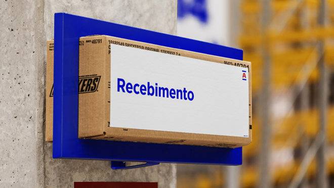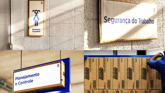 No Centro de Distribuição são recicladas diariamente cerca de três toneladas de caixas de papelão. A solução foi reutilizar essas caixas como suporte para toda a informação da sinalização modular. Todo o sistema é feito de papelão reutilizado, com suportes metálicos e impressão em vinil adesivo. Algo relativamente simples, mas muito bem pensado dentro da economia circular.